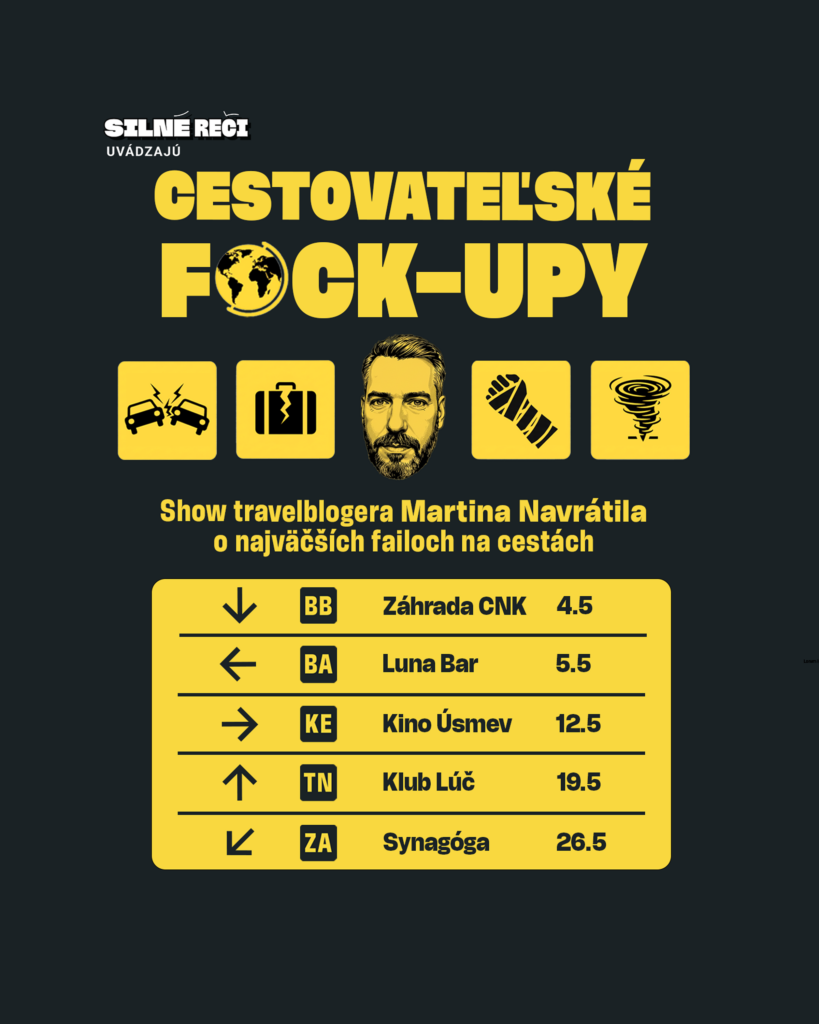 Cestovanie prináša aj nemilé prekvapenia. Či už stratíte batožinu, pokazí sa vám auto alebo prídete do krajiny, v ktorej majú iné zvyky. Show Cestovateľské F*ck-upy vás pripraví na každú situáciu. Zistite fun facty o jazyku, jedle, kultúrnych rozdieloch, riešení problémov a naučte sa užitočné tipy, ktoré na bežnej cestovateľskej prednáške nenájdete.